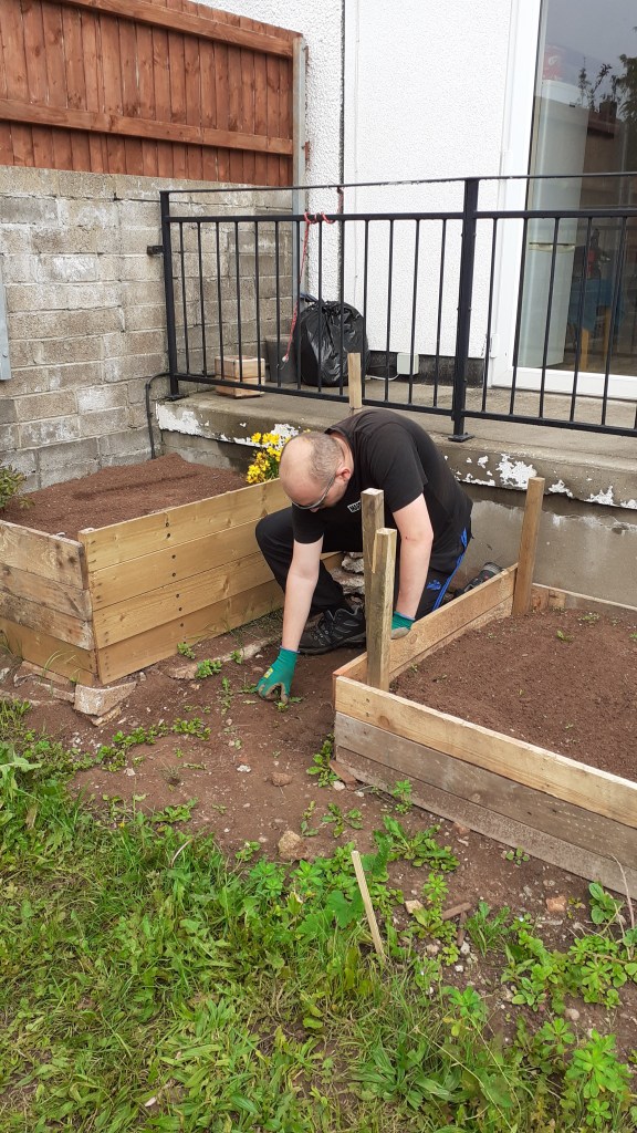 We have been very fortunate to be able to work with two of our participants in their garden in Sully . We started by working on the Nectar Cafe planting nectar rich plants to try and encourage pollinators to the garden and surrounding area. There had been a lack of butterflies, bees and other insects which was a cause for concern for both. Raised beds were built and nectar rich plants such as lavender , buddleia and sunflowers were planted in them.