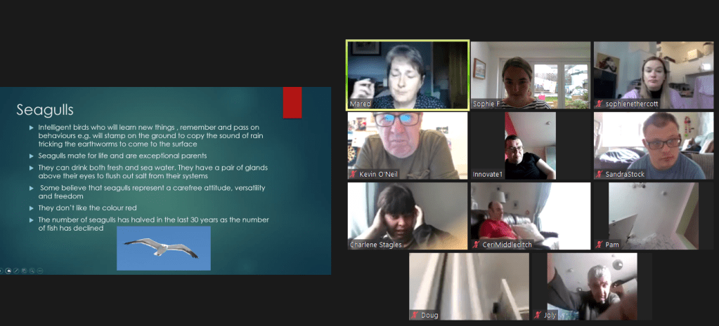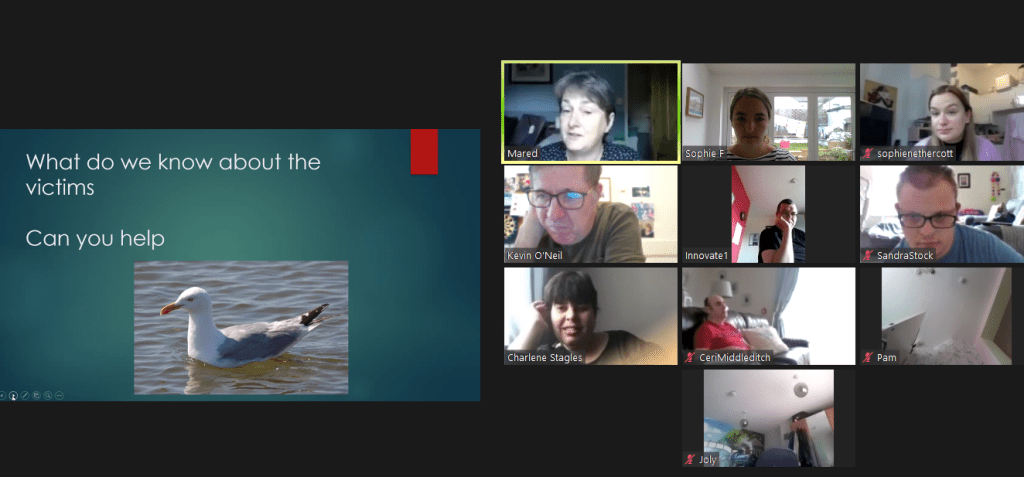 Our zoom sessions continue with a variety of topics from super senses to a further Murder Mystery . On this occasion we wanted to see what our participants knew about seagulls and how they have had to adapt to survive now that their natural habitats have been over fished and polluted. Nobody actually worked out that the perpetrators on this occasion were humans. What we did learn was that nobody were very fond of seagulls at the beginning of the session but by the end most had changed their minds and said that they would like to be able to learn more about them and did now appreciate their beauty when flying high in their natural surroundings. Even our participant who still couldn’t bring herself to like them wanted the perpetrators punished harshly and even asked for some photographs.