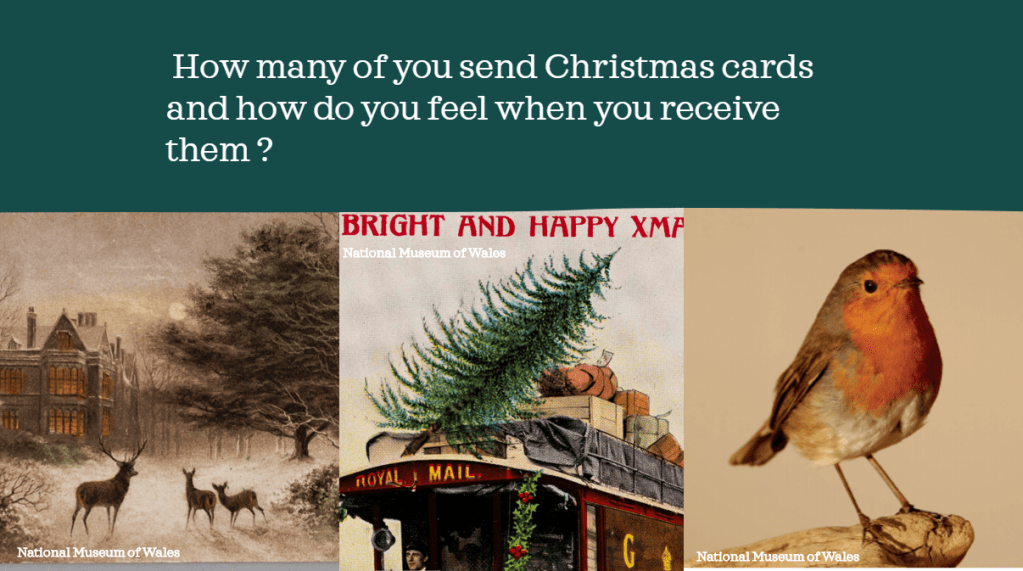 ‘We have been able to tailor one of our zoom sessions around the National Museum Wales’ ‘Objects of Comfort’ initiative which seeks to improve the wellbeing of the community by providing access to their digitised collection. Christmases past and present have brought many of our participants comfort and reassurance. Much of what many find comforting around Christmas revolves around Nature. By sharing memories and looking at old photographs we were able to learn much more about robins, mistletoe and snow.